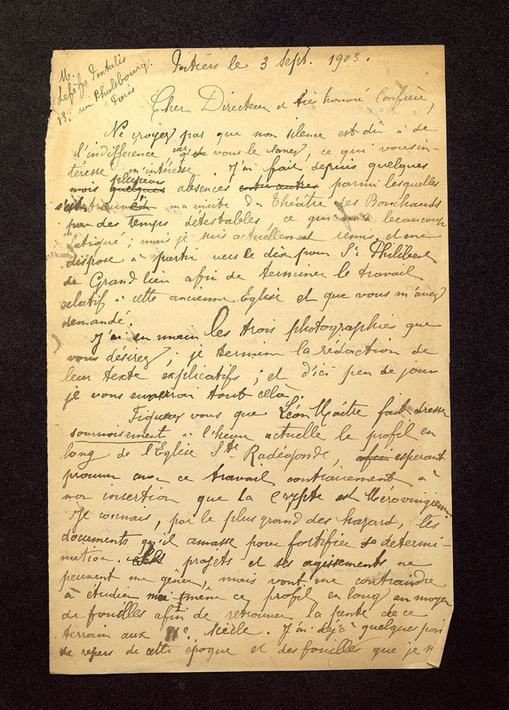<p><strong>Transcription</strong></p><p>M. Lefèvre-Pontalis 13, rue Phalsbourg Paris</p><p>Poitiers le 3 sept 1903</p><p>Cher Directeur et très honoré confrère,</p><p>Ne croyez pas que mon silence est dû à de l'indifférence, car vous le savez, ce qui vous intéresse m'intéresse. J'ai fait depuis quelques mois plusieurs absences parmi lesquelles s'est trouvée ma visite du théâtre des Bouchauds par des temps détestables, ce qui m'a beaucoup fatigué ; mais je suis actuellement remis, et me dispose à partir vers le dix pour St Philibert de Grandlieu afin de terminer le travail relatif à cette ancienne église et que vous m'avez demandé.</p><p>J'ai en main les trois photographies que vous désirez ; je termine la rédaction de leur texte explicatif ; et d'ici peu de jours je vous enverrai tout cela.</p><p>Figurez-vous que Léon Maître fait dresser sournoisement à l'heure actuelle le profil en long de l'église Ste Radegonde, espérant prouver avec ce travail contrairement à mon insertion que la crypte est mérovingienne. Je connais, par le plus grand des hasards, les documents qu'il amasse pour fortifier sa détermination. Ses projets et ses agissements ne peuvent me gêner, mais vont me contraindre à étudier moi-même ce profil en long au moyen de fouilles afin de retrouver la pente de ce terrains aux VIe siècle. J'ai déjà quelques points de repère de cette époque et des fouilles que je suis<p><p>Saut de page</p><p>autorisé à faire dans la crypte et au dehors compléteront mes connaissances à ce sujet. J'ai de plus l'autorisation de me rendre compte par une section latérale de ce fameux mur de 4m85 qui constitue actuellement la crypte elle-même. Il me sera donc facile de savoir si ce mur renferme un mur de crypte établi par Radegonde. Vous le voyez cher ami, la contradiction dans cette circonstance me laisse bien calme, et ne me gêne en rien. Je n'ai qu'un regret c'est de penser qu'à mon retour de St Philibert il me faudra consacrer près d'une semaine pour combattre victorieusement mon téméraire et inconscient adversaire.</p><p>Veuillez agréer, Cher Président et très honoré confrère, l'expression de mes respects bien reconnaissants et très dévoués en N. S.</p><p>P.S. je vous demande une grande discrétion au sujet des détails que je viens de vous donner concernant la marche que je vais [illisible] dans [illisible] de Ste Radegonde.<p>