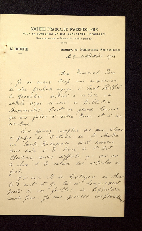 <p><strong>Transcription</strong></p><p>Société française d'archéologie</p><p>Andilly, par Montmorency (Seine-et-Oise)</p><p>Le 9 septembre 1903</p><p>Mon Révérend Père</p><p>Je ne saurais trop vous remercier de votre prochain voyage à Saint Philbert de Grandlieu destiné à valoir un article signé de vous au Bulletin Monumental. C'est un grand honneur que vous faites à notre Revue et à son directeur.</p><p>Vous pouvez compter sur mon silence à propos de l'étude de M. Maître sur Sainte Radegonde qu'il réserve sans doute à la Revue de l'Art Chrétien, moins difficile que moi sur le choix et la valeur des articles de fond.</p><p>J'ai revu M. de Lasteyrie au Mans le 2 août et je lui ai longuement parlé de vos fouilles du baptistère Saint-Jean. Je vous préviens confidentiellement<p><p>Saut de page</p><p>qu'il se refuse à admettre votre restitution du plan au IVe siècle. Il prétend que ce n'est pas un plan de baptistère, que votre théorie sur le dépôt des aubes contenues dans un long et étroit vestiaire est invraisemblable. Bref, apprêtez-vous à batailler avec lui un jour ou l'autre. C'est d'ailleurs le sort commun des piocheurs de se faire critiquer et j'en sais quelque chose à propos de mes fouilles de Chartres.</p><p>Dans une lettre précédente, vous me demandiez si j'avais quelque conseil à vous donner au sujet de votre future 2eme édition de votre étude sur le baptistère. C'est bien ambitieux de ma part de répondre à une pareille invité, mais à votre place, je diviserais le travail en 2 parties. Histoire de l'édifice et Description du baptistère pour que le lecteur puisse mieux suivre votre pensée de loin et sur place. L'histoire serait courte et la description étendue. Ce nouveau plan<p><p>Saut de page</p><p>implique sans doute un remaniement complet du texte, mais je sais que le travail intellectuel ne vous fait pas plus peur que les travaux de terrassement.</p><p>En vous remerciant aussi des photos que vous m'annoncez avec leurs notices explicatives, je vous prie de me croire toujours</p><p>Votre bien dévoué</p><p>Eugène Lefèvre-Pontalis<p>