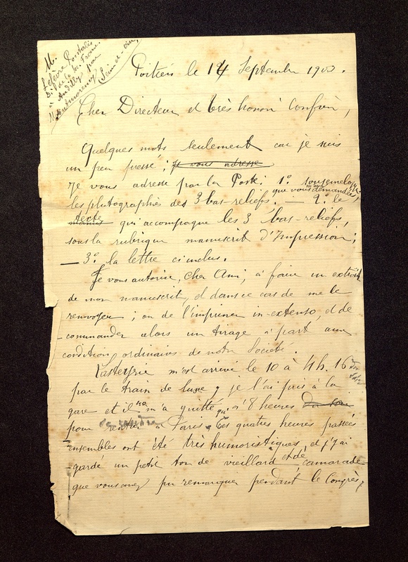 <p><strong>Transcription</strong></p><p>M. Lefèvre-Pontalis Dr de la Soc. Franc.</p><p>à Andilly par Monmorency (Seine-et-Oise)</p><p>Poitiers le 14 Septembre 1903</p><p>Cher Directeur et très honoré confrère,</p><p>Quelques mots seulement car je suis un peu pressé</p><p>Je vous adresse par la Poste : 1° sous enveloppe les photographies des 3 bas reliefs que vous m'avez demandées ; 2° le texte qui accompagne les 3 bas reliefs, sous la rubrique manuscrit d'impression ;</p><p>3° la lettre ci-inclus.</p><p>Je vous autorise, cher ami, à faire un extrait de mon manuscrit, et dans ce cas de me le renvoyer ; ou de l'imprimer in-extenso, et de commander alors un tirage à part aux conditions ordinaires de votre Société.</p><p>Lasteyrie m'est arrivé le 10 à 4h16 du soir par le train de luxe ; je l'ai pris à la gare et il ne m'a quitté qu'à 8 heures pour se rendre à Paris. Ces quatre heures passées ensemble ont été très humoristiques, et j'y ai gardé un petit ton de vieillard et de camarade que vous avez pu remarquer pendant le Congrès,<p><p>Saut de page</p><p>petit ton qui a été certainement tout autre que celui qu'il rencontre dans ses nombreuses présidences officielles, ainsi de la part du grand nombre de pauvres et déshérités archéologues de Province, qui s'attachent à sa personne.</p><p>Ce savant n'accepte que ce qu'il a vu lui-même, et ne s'en rapporte en rien à ce que d'autres que lui ont constaté.</p><p>Bref, tout s'est bien passé, et je lui ai aimablement dit qu'il pourrait, sans se gêner, combattre par écrits les résultats de mes découvertes, parce que je croyais pouvoir les défendre [illisible].</p><p>Il m'a bien aussi demandé communication des relevés que j'ai faits depuis 7 ans à St Philibert, mais, tout en m'y refusant avec<p>