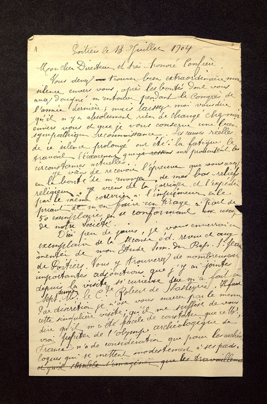 <p><strong>Transcription</strong></p><p>Poitiers le 13 juillet 1904</p><p>Mon cher Directeur et très honoré confrère</p><p>Vous devez trouver bien extraordinaire mon silence envers vous après les bontés dont vous avez daigné m'entourer pendant le Congrès de l'année dernière ; mais laissez moi vous dire qu'il n'y a absolument rien de changé chez moi envers vous et que je vous conserve une bien sympathique reconnaissance. Les causes réelles de ce silence prolongé ont été : la fatigue, le travail, l'écoeurement que me produisent les circonstances actuelles.</p><p>Je viens de recevoir l'épreuve que vous avez eu la bonté de m'envoyer de mes bas-reliefs religieux. Je viens de la corriger et l'expédier par le même courrier à l'imprimeur en le priant de m'en faire un tirage à part de 50 exemplaires en se conformant aux usages de notre Société.</p><p>D'ici peu de jours, je vous enverrai un exemplaire de la seconde éd. revue et commentée de mon étude som. du bap. St Jean de Poitiers. Vous y trouverez de nombreuses importantes adjonctions que j'y ai jointes depuis la visite si curieuse que m'a fait en sept dernier M. le Cte Robert de Lasteyrie. Par discrétion, je n'ose vous narrer par e menu cette singulière visite ; qu'il me suffise de vous dire qu'il m'a été facile de constater que ce Mr, vrai Jupiter de l'Olympe archéologique de France n'a de considération que pour les archéologues qui se mettent modestement à ses pieds.<p><p>Saut de page</p><p>Inutile de vous dire que je ne m'y suis pas mis.</p><p>Ceci m'amène tout naturellement à vous entretenir un instant de St Filib. Figurez-vous d'abord que ce [illisible] achéogu a eu l'aplomb de me demander communication des relevés en des notes que j'ai pris dans son ancienne église et comme vous le pensez bien j'ai refusé poliment de satisfaire sa peu délicate indiscrétion. Je vous dirai ensuite que peu de temps après le congrès j'ai été m'installer pendant 22 jours à l'auberge de St Philibert, afin de compléter l'étude archéol de cet important monument, étude commencée en 1898, de cet important monument. Actuellement il ne me reste plus un mur à sonder et pas un décimètre carré du sol de l'édifice dont je ne me sois rendu compte. Je trouve dans ce monument 5 époques fort distinctes et j'applique à 2 d'entre elles les textes de 815 et de 836. La rédaction de mon travail qui aura pour titre : Analyse de l'ancienne église de St Phil. de Grandlieu d'après des sondages, des fouilles et des textes, sera j'en suis sûr aussi clair, aussi méthodique et aussi concluant que mon Etude Som. du Bap. St Jean de Poitiers. La rédaction de cet ouvrage est en bonne voie, mais en est vraiment<p><p>Saut de page</p><p>fort difficile à faire. Les 50 premières pages en sont terminées, mais il n'en reste encore davantage à rédiger. Ce travail comportera environs 150 pages et sera accompagné de 6 grandes planches dont les dessins sont terminés.</p><p>Monsieur le Maire de St Filbert de g. l.qui connaît la situation qui m'est faite par M. Léon Maître est décidé à faire après la rentrée prochaine un petit Congrès archéol. qui se tiendrait dans l'ancienne église sous sa présidence et auquel il inviterai les Membres de la</p><p>Soc. archéol. de Nantes, ainsi que toutes les personnes qui témoigneraient le désir d'y assister. J'ai accepté cet offre et je me propose d'y donner lecture de tout mon manuscrit, lecture qui demandera au moins 2 heures et qui sera accompagnée de grands plans peints sur toile. Il va sans dire que je faciliterai les questions, les objections ainsi que les discussions pourvu qu'elles soient courtoises.</p><p>Des membres de la Soc. d'Arch. de Nantes m'ayant exprimés le désir</p><p>de publier mon travail sur cette église, je leur ai répondu que je m'étais engagé envers vous ; ils m'ont depuis avertis que vous aviez accédé à leur désir et que par la même ce travail paraitraît dans votre publication ainsi que dans la leur ; Si ces renseignements sont exacts on pourait peut-être diminuer les frais de cette publication en les partageant entre les 2 sociétés. Mais je n'insiste point sur ce sujet, car je ne crois pas être renseigné d'une manière complètement ferme ; et du reste rien ne presse. Seriez vous désireux d'assister à cette conférence, car dans le cas de l'affirmative le Maire lui-même<p><p>Saut de page</p><p>ferait un plaisir de vous y inviter.</p><p>Je vous demande, cher Directeur et ami de ne pas ébruiter cette conférence attendu qu'elle restera ignorée jusqu'au moment des convocations car le Maire et moi comptons l'organiser comme conférence régionale et non pas comme conférence archéologique à laquelle prendrai part certains archéologues qui prétendent que l'on ne peut se passer d'eux. Je suis du reste fort décidé, si j'y vois certains personnages que vous devez deviner de lever la séance sans y prendre la parole. Ces critiques malveillants et de parti pris auront toute facilité pour me critiquer ou me combattre quand mon texte sera publié. Ces du reste animé de cette esprit que j'ai remis un second exemplaire de mon Etude Som. du Bapt. à M. Robert de Lasteyrie lors de sa visite au Bap. lui disant "conservez ce second exemplaire il vous servira à en détacher avec des ciseaux les passages que vous croiriez pouvoir attaquer et je répondrai à vos attaques avec les seuls éléments qui se trouvent dans ce petit volume".</p><p>Voilà donc mon cher Dr et ami un bien longue lettre, qui je pense, me fera pardonner le long silence que j'ai gardé avec vous depuis un an. Mais vous le comprendrez j'en suis sûr tout ce qu'elle contient demande une certaine réserve, et je m'en rapporte entièrement à vous à ce sujet.</p><p>Inutile de vous dire que je compte sur une bonne réponse de votre part.</p><p>Tout ce que m'a dit M. de la Bouralière du Congrès, tenu au Ruy m'a vivement intéressé, et je vous félicite du résultat auquel vou