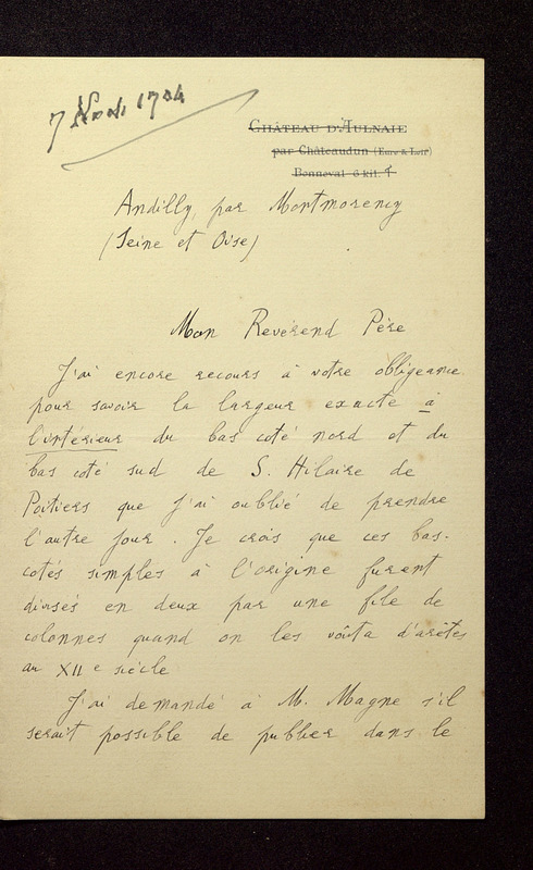 <p><strong>Transcription</strong></p><p>7 novembre 1904</p><p>Andilly par Montmorency (Seine et Oise)</p><p>Mon Révérend Père</p><p>J'ai encore recours à votre obligeance pour savoir la largeur exacte à l'intérieur du bas-côté nord et du bas-côté sud de S. Hilaire de Poitiers que j'ai oublié de prendre l'autre jour. Je crois que ces bas-côtés simples à l'origine furent divisés en deux par une file de colonnes quand on les voûta d'arêtes au XIIe siècle.</p><p>J'ai demandé à M. Magne s'il serait possible de publier dans le<p><p>Saut de page</p><p>volume du Congrès sans aucun commentaire une photo du soubassement du mur romain qu'on intercalerait dans le guide de La Bouralière au point où il dit que le Palais de Justice repose sur des murs antiques. C'est un simple document que je voudrais annexer au Congrès, si toutefois vous n'y voyez pas d'inconvénient au point de vue de votre future étude sue ces substructions.</p><p>Votre bien dévoué</p><p>E. Lefèvre-Pontalis<p>